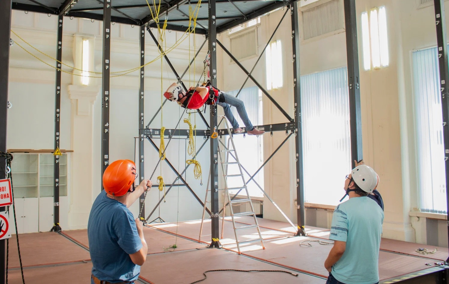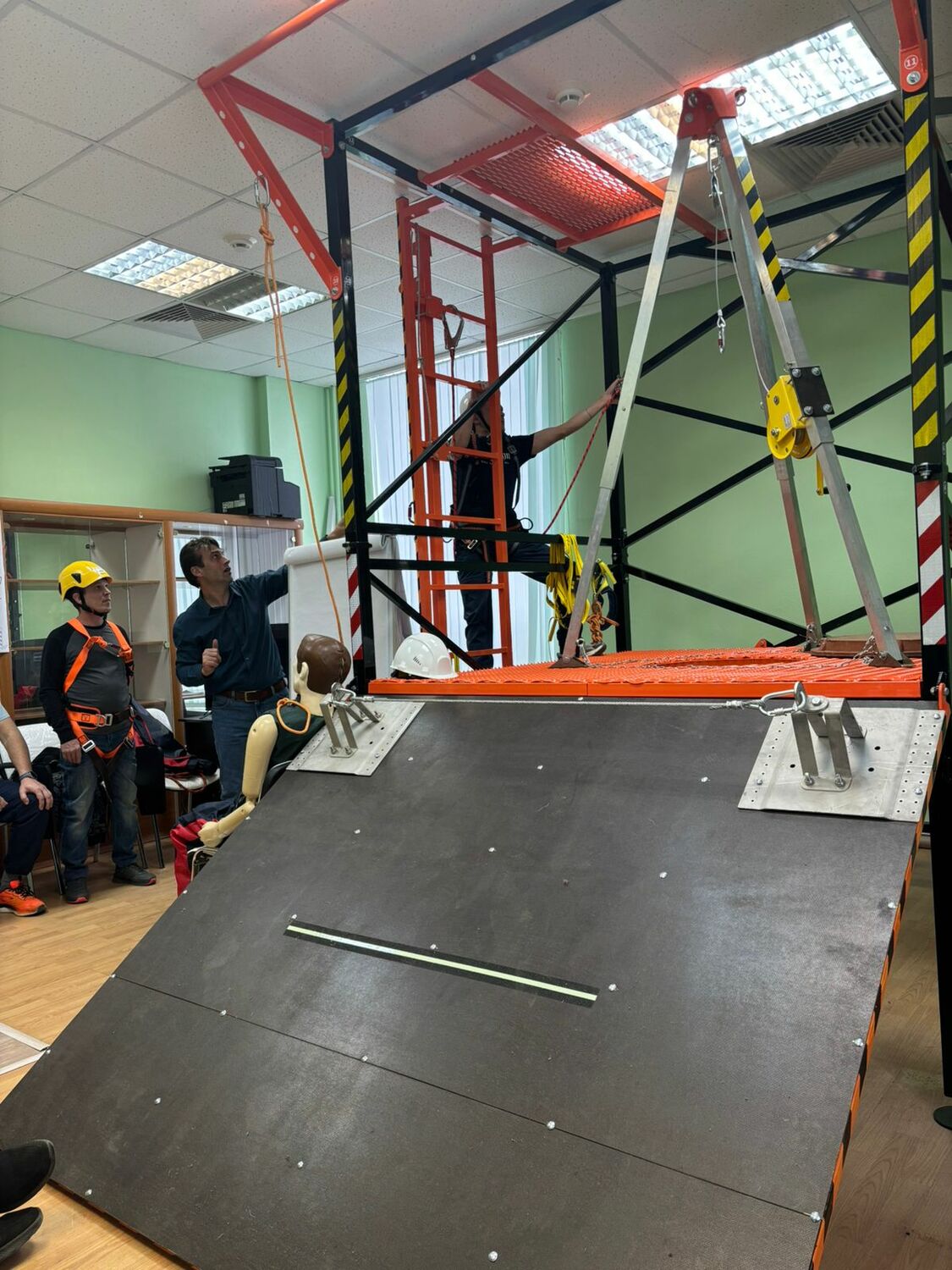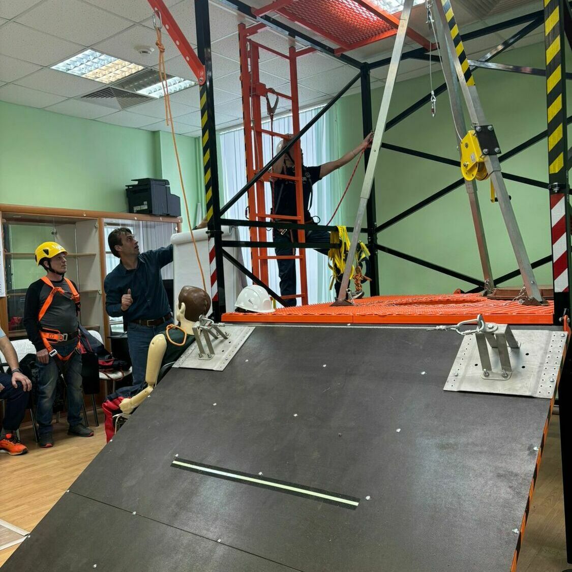 Во время практики слушатели отрабатывают реальные навыки на специально оборудованных полигонах: используются страховочные канаты, анкерные линии, строительные леса, тренажёры, имитирующие рабочие ситуации.